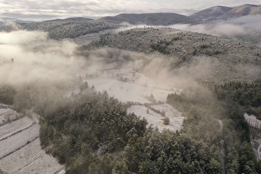 Kar beyazı ve sisle bütünleşen ilçe merkezi ile çevresindeki tarım arazileri dronla görüntülendi.