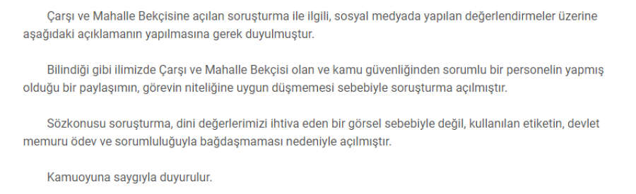 Tepkiler üzerine ikinci bir duyuruda bulunan Valilik, kentte Çarşı ve Mahalle Bekçisi olan ve kamu güvenliğinden sorumlu bir personelin yapmış olduğu bir paylaşımın, görevin niteliğine uygun düşmemesi sebebiyle soruşturma açıldığını kaydetti.