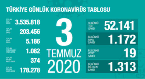 Türkiye'de koronavirüse bağlı olarak 19 kişi daha hayatını kaybetti, 1172 yeni tanı kondu. Toplam ölü sayısı 5 bin 186'ya, vaka sayısı 203 bin 456'ya yükseldi