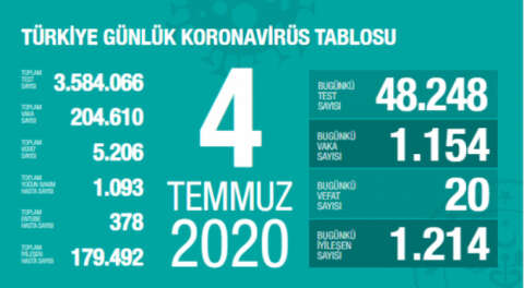 Sağlık Bakanlığı son 24 saatte koronavirüs nedeniyle 20 kişinin hayatını kaybettiğini, toplam can kaybının 5 bin 206 olduğunu açıkladı. Bugün 48 bin 248 kişiye test yapılırken, bin 154 yeni vaka tanısı konuldu, bin 214 kişi ise iyileşti.