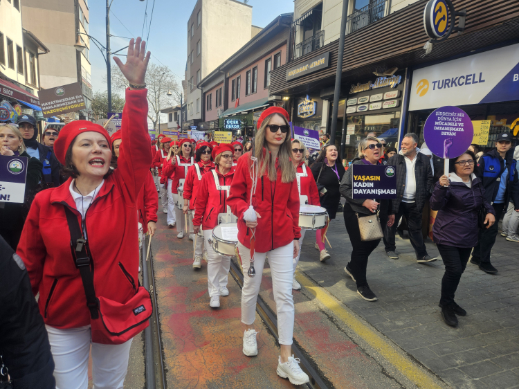 Bursa Büyükşehir Belediyesi, Nilüfer Belediyesi, Osmangazi Belesiyesi ve kent konseylerinin kadın meclisleri tarafından Barış Kadın Bandosu eşliğinde saat 14.00'da Cumhuriyet Caddesi'nde yürüyüş düzenlendi. 'Düşlediğimiz dünyayı birlikte kuracağız' mottosuyla düzenlenen yürüyüşte kadınlar, alkış ve ıslıklarla "Dünya yerinden oynar, kadınlar özgür olsa", "Susmuyoruz, korkmuyoruz, itaat etmiyoruz", "Kadın cinayetleri politiktir" sloganları attı.