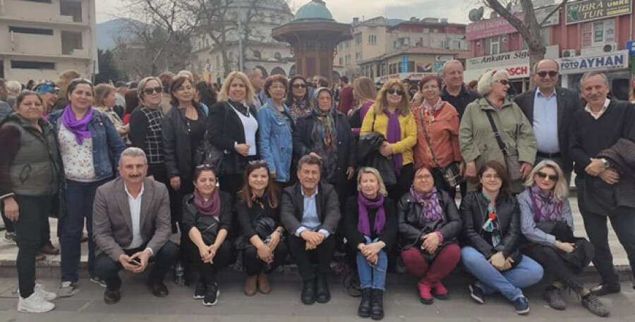 Yürüyüşe Gemlik Belediye Başkanı Mehmet Uğur Sertaslan, Başkan Yardımcısı Zeynep Akış Serintürk, CHP Gemlik İlçe Başkanı Cemil Acar da katıldı. Kalabalık kadın grubunun arkasında yer alan erkekler de "Tüm emekçi kadınların haklı mücadelesinde yanlarındayız" yazan pankart ile yürüdüler.