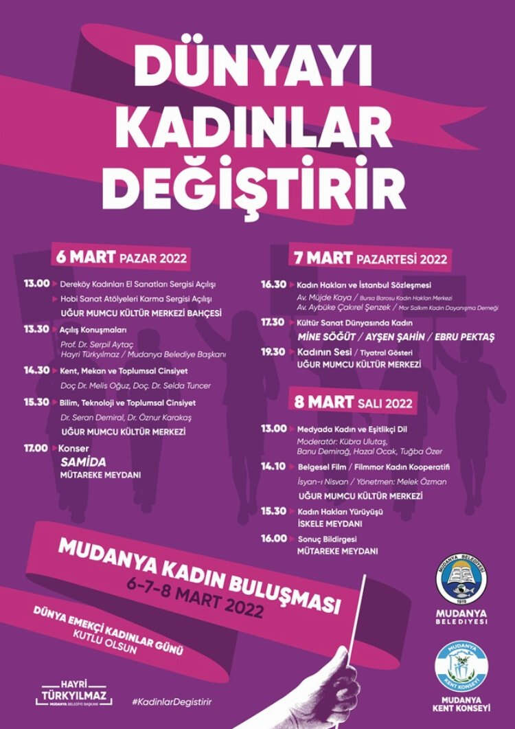 Mudanya Belediyesi’nin Mudanya Kent Konseyi iş birliğiyle düzenleyeceği “Dünyayı Kadınlar Değiştirir” etkinliği, pek çok akademisyen, gazeteci, yazar ve aktivisti söyleşi, tiyatro, belgesel, konser ve sergi ile dolu programda bir araya getirecek.