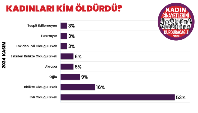 Kasım ayında 32 kadın cinayeti işlendi. Kadınların yüzde 53'ü evli olduğu erkek tarafından öldürüldü. Kadınların yüzde 63'ü evlerinde öldürüldü.
