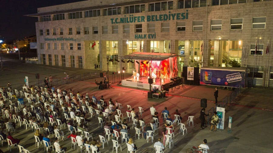 Koronavirüs pandemisi nedeniyle tiyatro sahnelerini açık havaya taşıyan Nilüfer Belediyesi Kent Tiyatrosu, yepyeni bir oyunla sanatseverlerin karşısına çıktı. "Nilüfer Kent Tiyatrosu Açıkhavada" etkinlikleriyle tiyatro tutkunları, yıldızların altında birbirinden güzel oyunları izleme fırsatı buluyor. Nilüfer Belediyesi Kent Tiyatrosu, "Şimdi Soruyorlar Bana Aziz Bu Hikâyeler Nerden..." adlı oyunun prömiyerini de, Nilüfer Belediyesi Halk Evi önündeki Cumhuriyet Meydanı'nda kurulan açık hava sahnesinde yaptı.