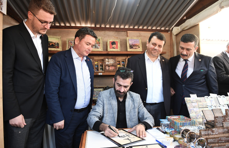 Vatandaşlarla bol bol sohbet eden Aydın, fuara katılan bir karikatüriste kendisinin resmini çizdirdi.