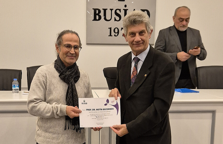 Soruları da yanıtlayan Doç. Dr. Türkyılmaz ve Prof. Dr. Becermen’e söyleşi sonunda, “ÇEK Kır Çiçekleri Okusun Diye” kampanyasına adlarına yapılan bağışın sertifikası, BUSİAD Yüksek Danışma Kurulu Başkanı Ergun Hadi Türkay ve BUSİAD Yönetim Kurulu Başkanı Buğra Küçükkayalar tarafından sunuldu.