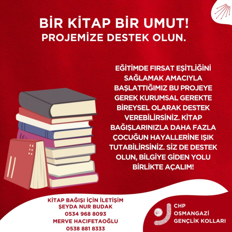 CHP Osmangazi İlçe Gençlik Kolları, eğitimde fırsat eşitliğini sağlamak için “Bir Kitap Bir Umut!” projesiyle kitap kampanyası başlattı.