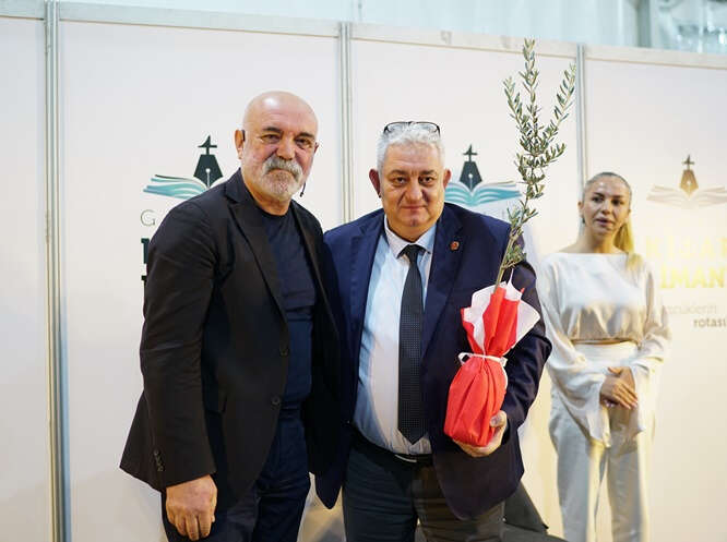 Gemlik Belediyesi Başkan Yardımcısı Mert Dimilli söyleşi bitimimde dinleyicilerin sorularını cevaplayan Kesal’a zeytin ağacı armağan etti.