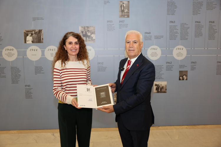 Ziyaretin sonunda Mustafa Bozbey, sergiye katkılarından dolayı Küratör Yasemin Bay’a hediye verdi.