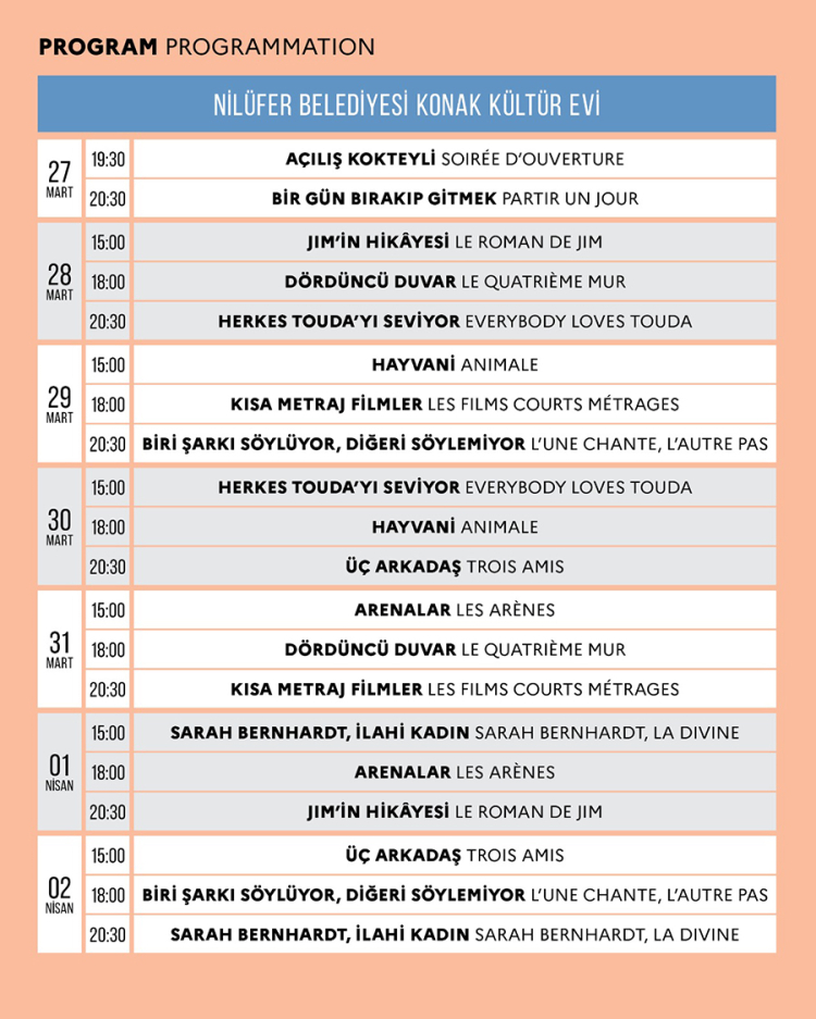 Nilüfer Belediyesi Konak Kültürevi’nin ev sahipliği yapacağı festival, 27 Mart günü açılış kokteyli ile başlayacak. Açılış filmi, aynı zamanda geçen yıl Cannes Film Festivali'nin açılış filmi olan “Bir Gün Bırakıp Gitmek” olacak. Gösterim kokteyl sonrası gerçekleşecek.