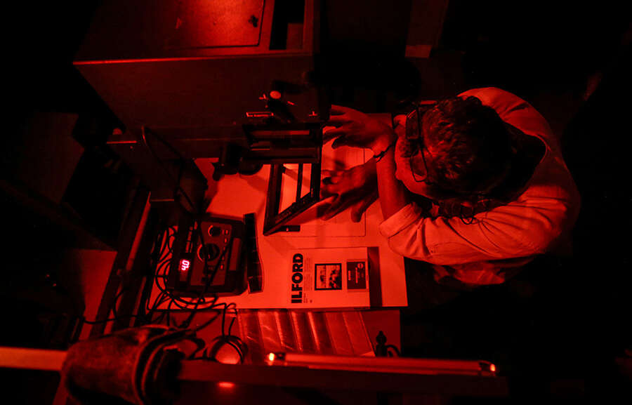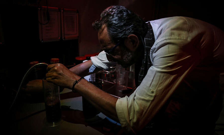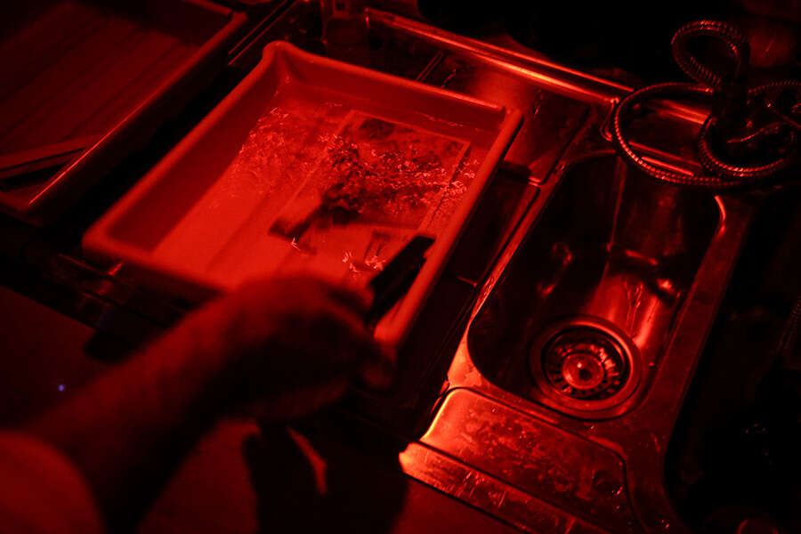 "Filmin banyo sürecinde üç kimyasalımız var: Geliştirici, durdurucu ve sabitleyici. İlk başta geliştiriciyi döküyoruz, geliştirici görüntünün ortaya çıkmasını sağlıyor. Bir sonraki kullandığımız banyo durdurucu. Kimyasalın reaksiyonunu durdurarak görüntünün geliştiği yerde kalmasını sağlıyor. Son banyo ise sabitleyici. Sabitleyici banyoda artık o üzerindeki bütün gümüş tuzları akıyor. Böylelikle o bizim siyah beyaz baktığımızda ışığa tuttuğumuzda gördüğümüz film oluşuyor aslında. Bütün bu kimyasallardan temizlenmek üzere bir akarsu üzerinde yıkanıyor ve tamamen kimyasallardan arınıyor. Ardından askıya bırakıyoruz. 4-5 saatte kuruyor ve böylelikle baskıya hazır hale geliyor."