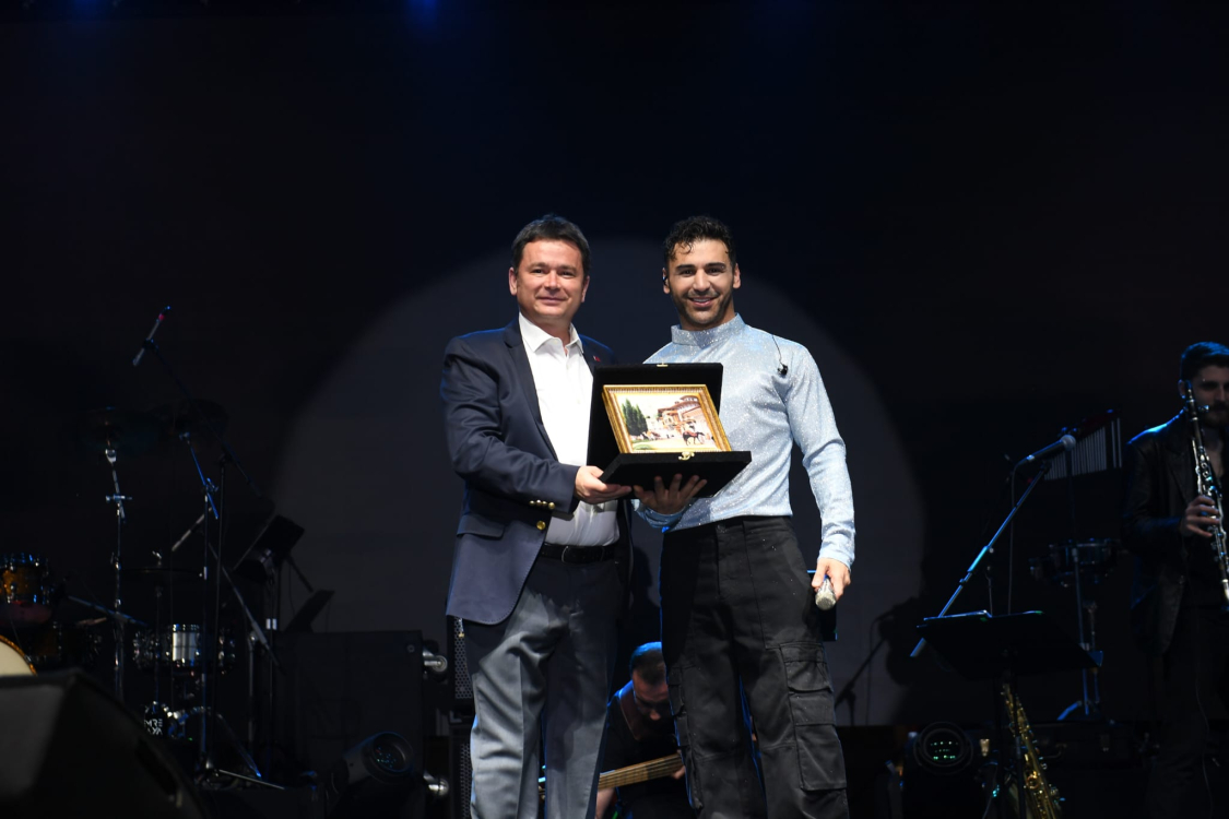 Konuşmasının ardından Başkan Aydın, ünlü sanatçı Emre Kaya’ya çiçek ve tablo hediye etti.