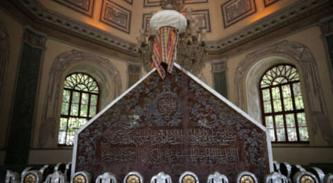 Sevim, sekizgen planlı, üzeri kubbeyle örtülü türbenin ortasındaki Osman Gazi'ye ait ahşap sandukanın etrafının sedef kakmalı, pirinç parmaklıklarla çevrili ve sandukanın üzerinin sırma işlemeli kadifeyle örtülü olduğunu sözlerine ekledi.