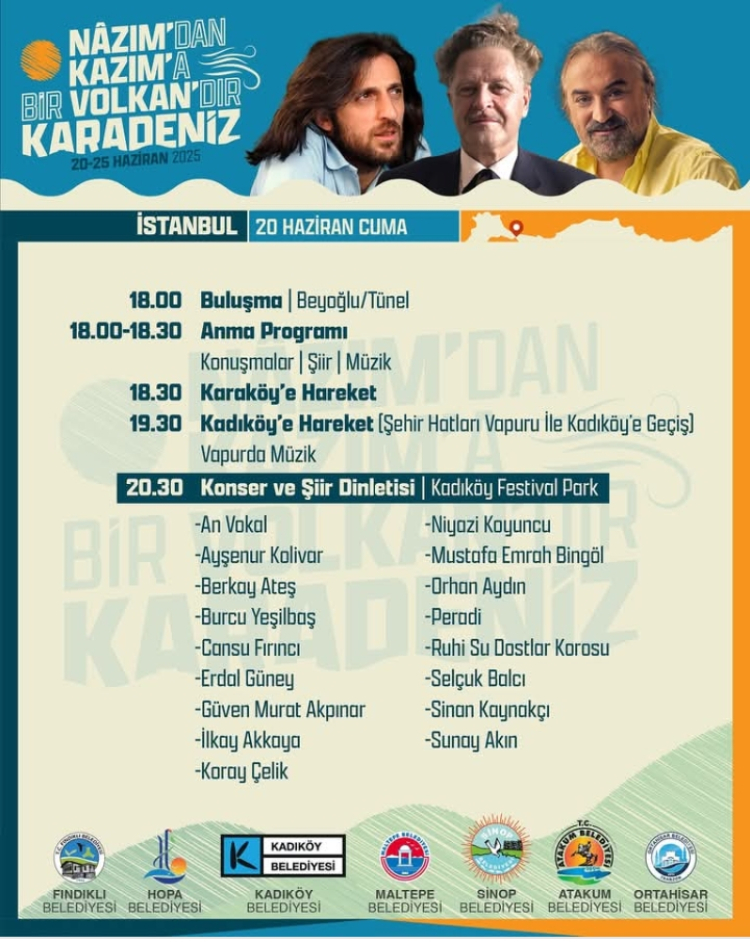 Fındıklı, Hopa, Kadıköy, Maltepe, Sinop, Atakum, Ortahisar Belediyeleri'nin iş birliğiyle düzenlenen etkinlik, 20 Haziran Cuma günü İstanbul'da gerçekleştirilecek programla başlayacak. Programda, şiir, müzik ve halk buluşmalarıyla dolu bir akşam katılımcıları bekliyor.