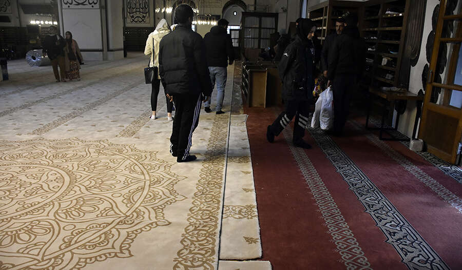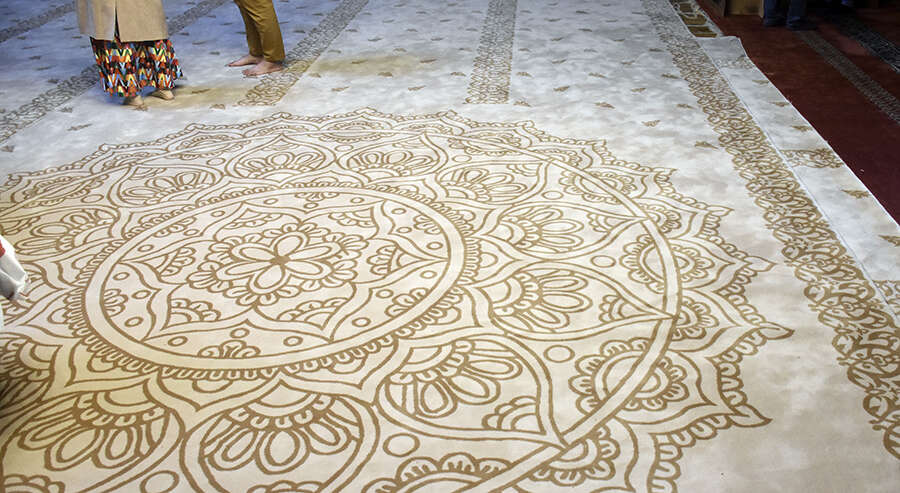 Camideki halılar açık renkte ve duvarlardaki hat sanatına uygun olarak yeniden üretildi.