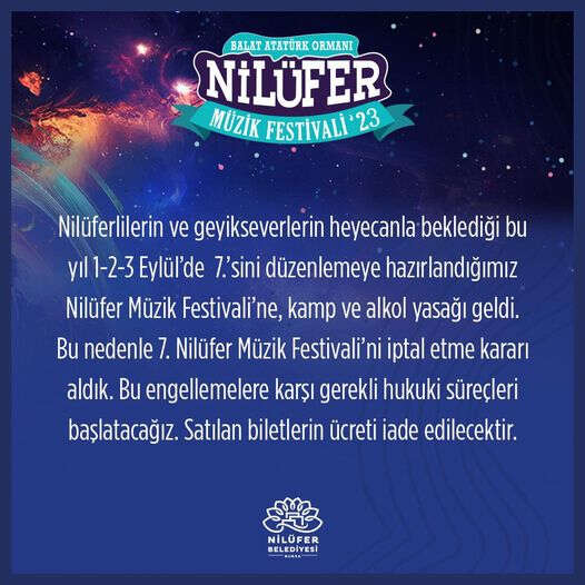 Nilüfer Belediyesi'nin sosyal medya hesabından konuyla ilgili yapılan açıklamada, "Nilüferlilerin ve geyikseverlerin heyecanla beklediği bu yıl 1-2-3 Eylül’de 7.’sini düzenlemeye hazırlandığımız Nilüfer Müzik Festivali’ne, kamp ve alkol yasağı geldi. Bu nedenle 7. Nilüfer Müzik Festivali’ni iptal etme kararı aldık. Bu engellemelere karşı gerekli hukuki süreçleri başlatacağız. Satılan biletlerin ücreti iade edilecektir." denildi.