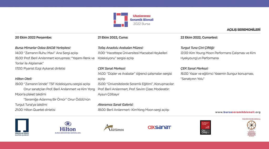 Küratörlüğünü Mutlu Başkaya, Fatma Batukan Belge ve İlhan Marasalı’nın yaptığı Uluslararası Seramik Bienali’nin sergileri ve etkinlikler Bursa Mimarlar Odası BAOB Yerleşkesi, Tofaş Anadolu Arabaları Müzesi bahçesi, ÇEK Sanat Vakfı galerisi, Hilton Oteli fuayesi ve bahçesi, Akeramos Sanat Merkezi ve Turgut Tuna Çini Çiftliği olmak üzere çeşitli mekanlara yayılacak.