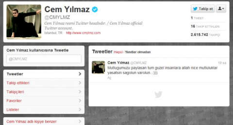 Twitter'da 2 milyon 615 bin 742 takipçisi olan Cem Yılmaz, attığı bu twitleri daha sonra sildi ve sadece "Mutlugumuzu paylasan tum guzel insanlara allah nice mutluluklar yasatsin sagolun varolun..:)))" yazan twiti bıraktı.