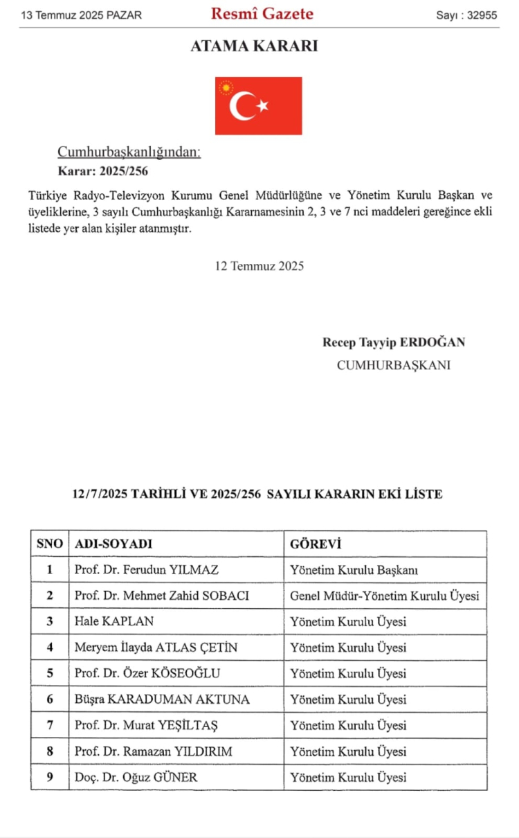 TRT Yönetim Kurulu Başkanlığına Bursa Uludağ Üniversitesi Rektörü Prof. Dr. Ferudun Yılmaz, Yönetim Kurulu üyeliklerine ise Hale Kaplan, Meryem İlayda Atlas Çetin, Prof. Dr. Özer Köseoğlu, Büşra Karaduman Aktuna, Prof. Dr. Murat Yeşiltaş, Prof. Dr. Ramazan Yıldırım ve Doç. Dr. Oğuz Güner getirildi.