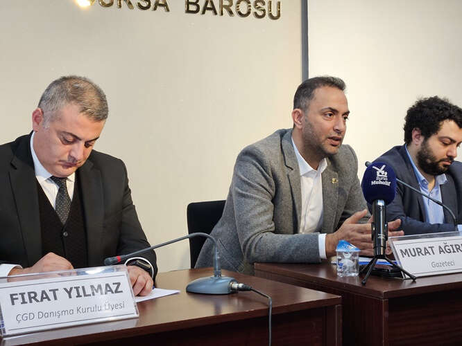 Bursa Barosu ve Çağdaş Gazeteciler Derneği (ÇGD) Bursa Şubesi’nin ortak düzenlediği ‘Yaşananlar Boşuna Değil’ söyleşisinde, basın özgürlüğü ve yaklaşan seçimler ele alındı. Bursa Akademik Odalar Birliği (BAOB) Av. Özgür Aksoy Konferans Salonu'nda düzenlenen söyleşiyi, Bursa Barosu’ndan Avukat Ali Dokuzlu’nun yönetti. Avukat Celal Ülgen, Gazeteci Murat Ağırel, ÇGD Danışma Kurulu üyesi Fırat Yılmaz konuşma yaptı.