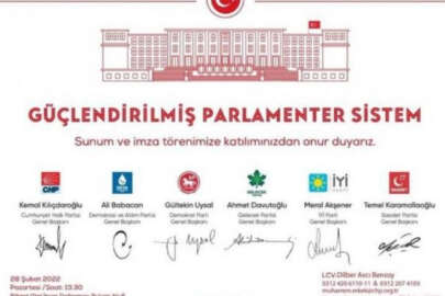 Başlığında, "Güçlendirilmiş Parlamenter Sistem" yazan davetiyede, 6 partinin logoları ve genel başkanlarının isimleriyle birlikte imzaları yer alıyor.