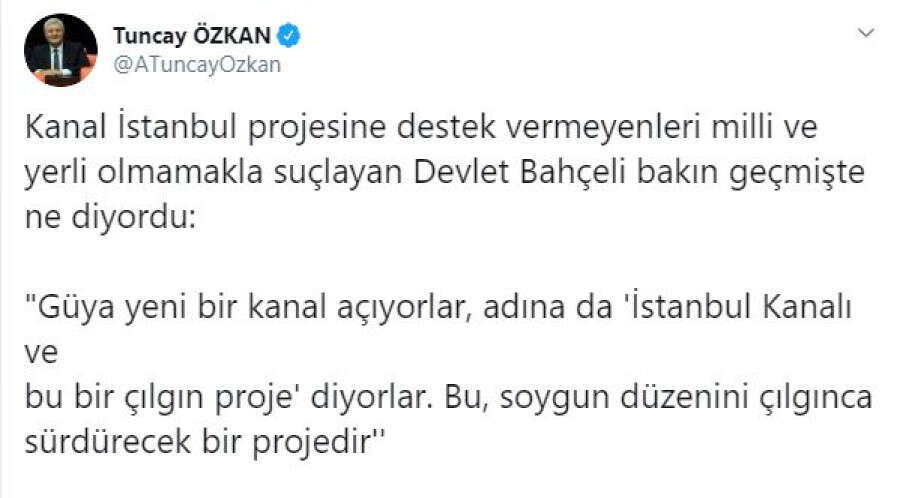 CHP Genel Başkan Yardımcısı Tuncay Özkan, bugün yaptığı açıklamada Kanal İstanbul projesine destek vermeyenleri milli ve yerli olmamakla suçlayan MHP Genel Başkanı Devlet Bahçeli'nin 2011 yılında proje açıklandığında söylediklerini sosyal medya hesabından paylaştı. Özkan'ın paylaşımı kısa sürede yoğun paylaşım ve yorum aldı.
