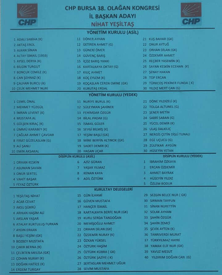 Cumhuriyet Halk Partisi (CHP) Bursa 38. Olağan İl Kongresi, 17 Eylül pazar günü Merinos Atatürk Kongre ve Kültür Merkezi'nde gerçekleştirildi. Üç adayın yarıştığı kongrede, 323 oy alan Nihat Yeşiltaş yeni CHP Bursa İl Başkanı oldu. Adaylardan CHP eski İl Başkanı ve Atatürkçü Düşünce Derneği Bursa Şubesi Başkanı Gürhan Akdoğan 152, mevcut İl Başkanı Turgut Özkan 120 oy aldı.