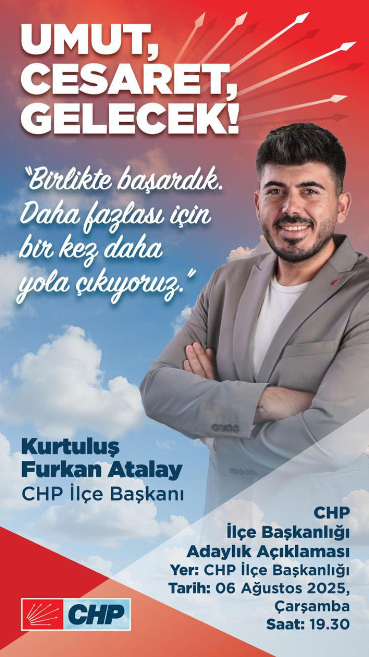 Mevcut Başkan Kurtuluş Furkan Atalay, "Hep birlikte, daha ileriye! Birlikte çıktığımız bu yolda, hizmeti büyütmek ve güçlendirmek için bir adım daha atıyoruz. İlçe başkanlığına yeniden adaylığımı açıklayacağım toplantıya katılımınız bizlere güç verecek" mesajıyla 6 Ağustos Çarşamba günü İlçe Başlanlığı'nda saat 19.30'da adaylık açıklamasını yapacağını duyurdu.