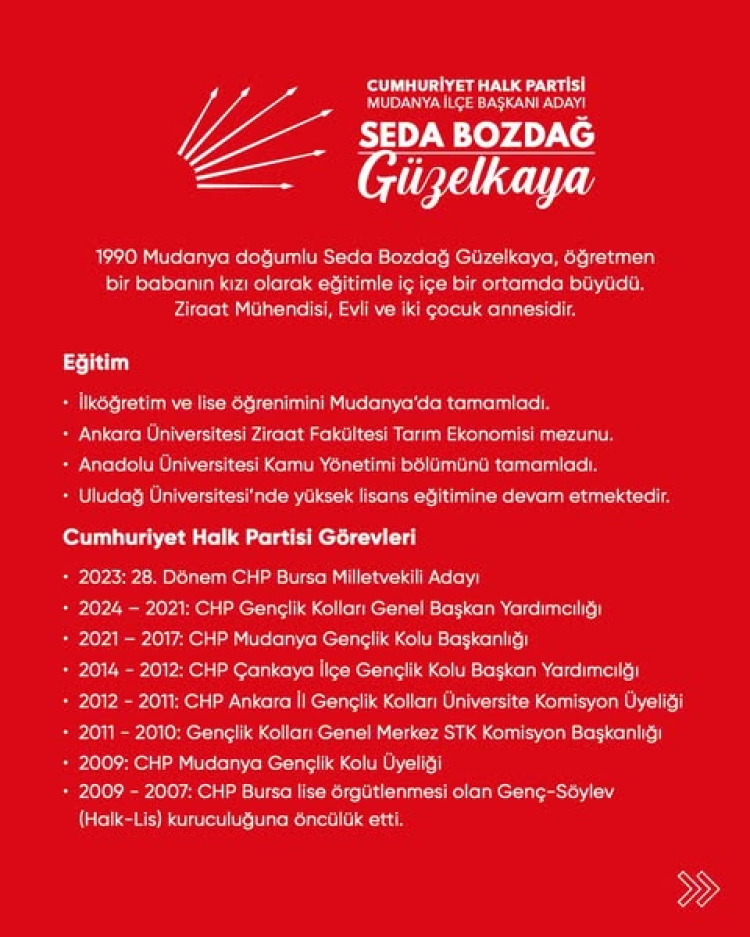Cumhuriyet Halk Partisi Mudanya İlçe Başkan Adayı olarak çıktığım bu yolda, sizlerle birlikte yürümekten onur duyuyorum. Geçmişten bugüne birlikte ürettiğimiz, emek verdiğimiz ve mücadele ettiğimiz süreci bir kez daha hatırlatmak istedim.