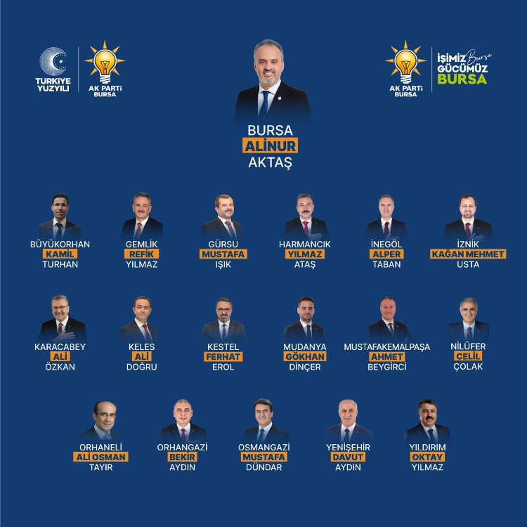 AK Parti'nin Bursa Büyükşehir Belediye Başkan adayı olarak mevcut başkan Alinur Aktaş açıklanmıştı. Erdoğan, 31 Mart yerel seçimlerinde AK Parti'nin ilçe belediye başkan adaylarını şöyle açıkladı: