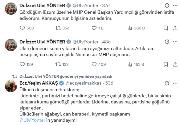 MHP genel Başkan Yardımcısı İzzet Ulvi Yönter, sosyal medya platformu X'te gün içinde yaptığı bazı paylaşımların ardından görevinden istifa ettiğini açıkladı. Yönter, "Gördüğüm lüzum üzerine MHP Genel Başkan Yardımcılığı görevinden istifa ediyorum. Kamuoyunun bilgisine arz ederim." ifadelerini kullandı.