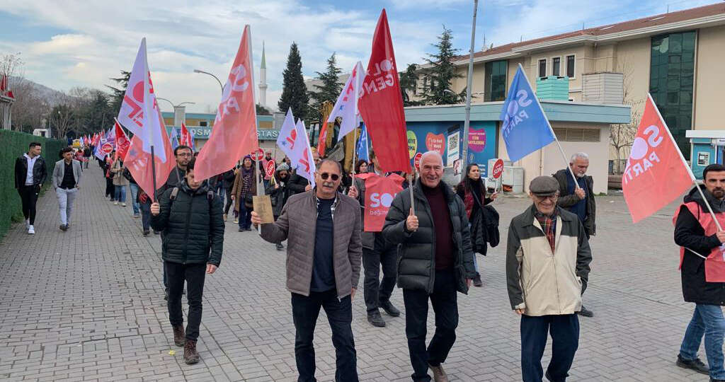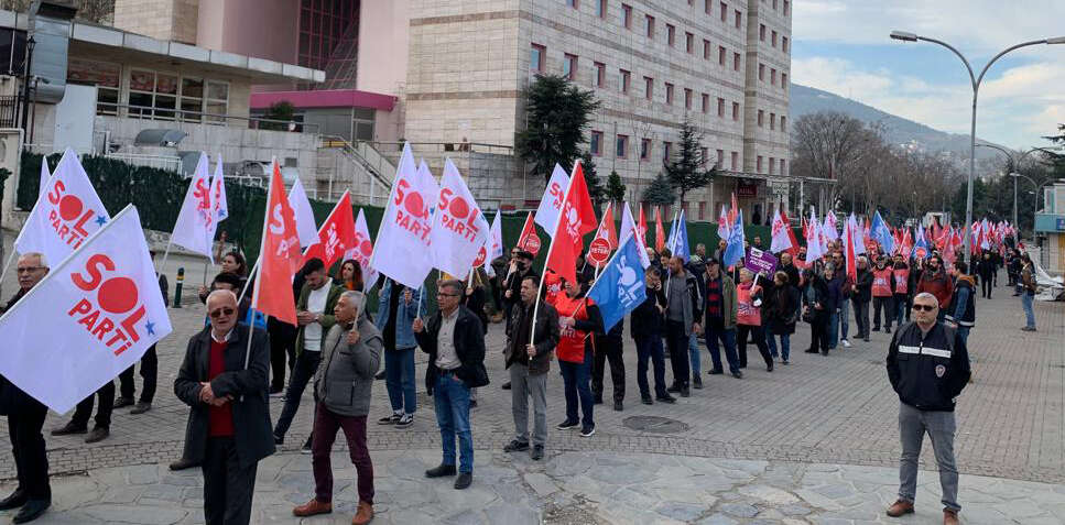 Saat 12.00'de BursaRay'ın Osmangazi İstasyonu arkasında buluşan SOL Partililer buradan pankart, parti bayrağı ve dövizlerle sloganlar atarak Kent Meydanı’na doğru yürüyüş gerçekleştirdi.