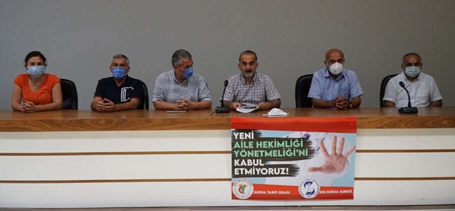 Bursa Tabip Odası ve Sağlık ve Sosyal Hizmet Emekçileri Sendikası'nın (SES) ortak basın açıklamasında, "Aile hekimlerini baskıyla susturmaya dönük, neredeyse keyfi işten atma ve ücret kaybına yol açarak mevcut haklarını kısıtlayacak yönetmeliği kabul etmiyoruz" denildi.