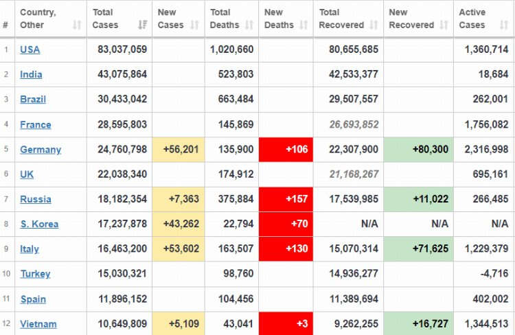 Worldometers sitesine yansıyan verilere göre; Türkiye’de şimdiye kadar 15 milyon 30 bin 321 vaka tespit edildi, 98 bin 760 kişi yaşamını yitirdi, 14 milyon 936 bin 337 kişi iyileşti. Bu sayılara göre Türkiye’de dün itibariyle aktif vaka sayısı ise eksi 4 bin 716 olarak gerçekleşti.