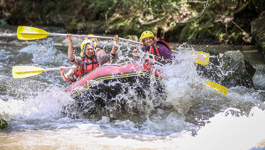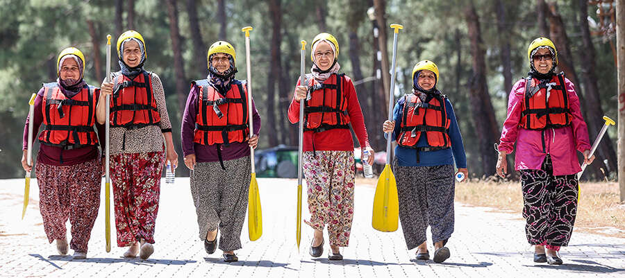 Kendileri için düzenlenen özel programda yörede giyilen şalvar ve lastik ayakkabılarıyla rafting botuna binen köylü kadınlar, hayatlarında ilk kez rafting yaptı. Şarkılar eşliğinde kürek çekerek parkuru tamamlayan kadınlar, unutulmaz anlar yaşadı.