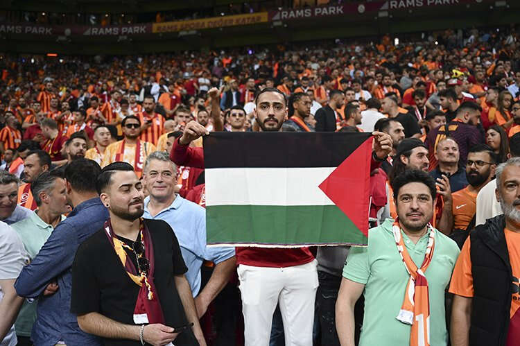 Müsabaka öncesinde iki takım oyuncuları seremoniye Türkiye Futbol Federasyonunun hazırlattığı "Gazze'de yapılan zulmü kınıyoruz." pankartıyla çıktı.