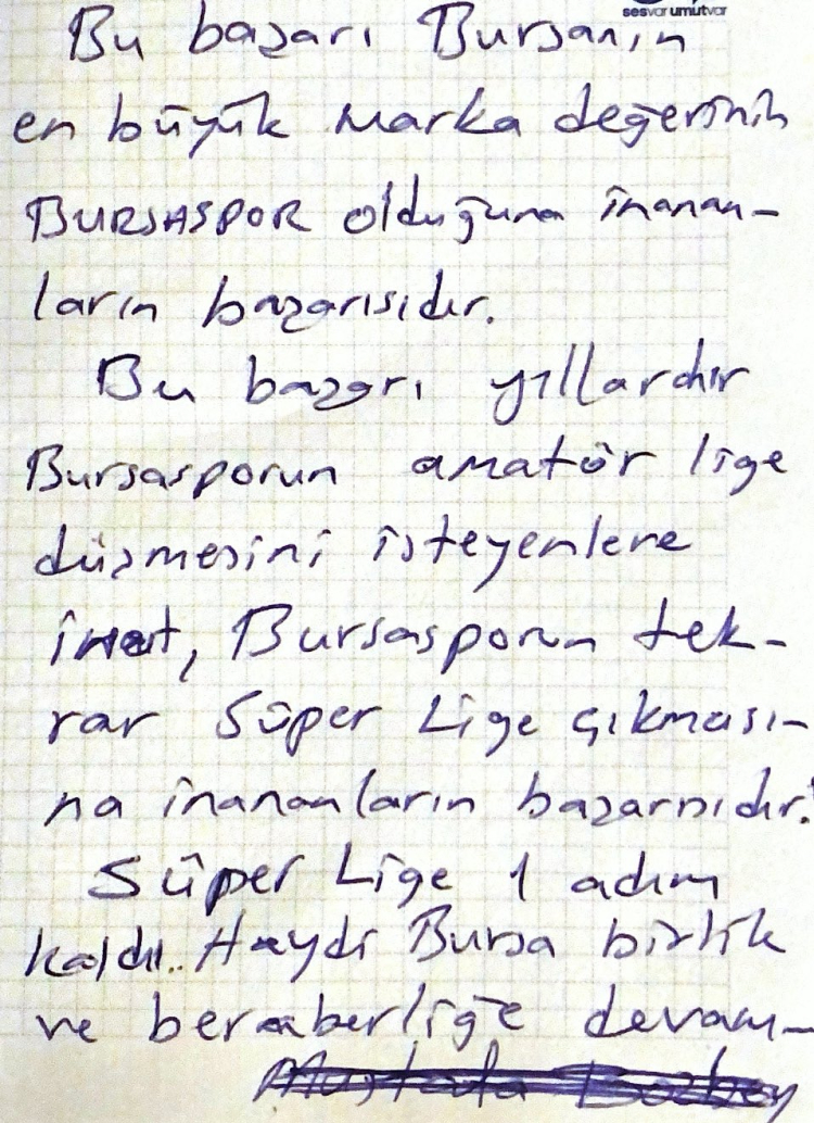 Bursa Cumhuriyet Başsavcılığının soruşturması kapsamında tutuklanarak görevden uzaklaştırılan Bursa Büyükşehir Belediye Başkanı Mustafa Bozbey'in yeşil beyazlı camiaya yazdığı mektup sosyal medya hesabından paylaşıldı.