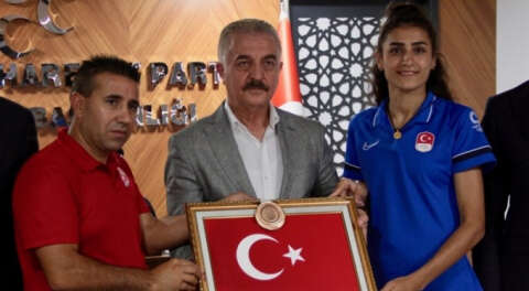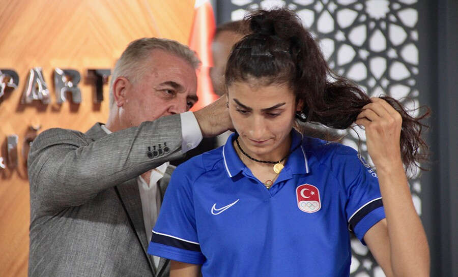 MHP Genel Sekreteri İsmet Büyükataman, 2020 Tokyo Olimpiyat Oyunları'nda bronz madalya kazanan milli tekvandocu Hatice Kübra İlgün'e cumhuriyet altını hediye etti.