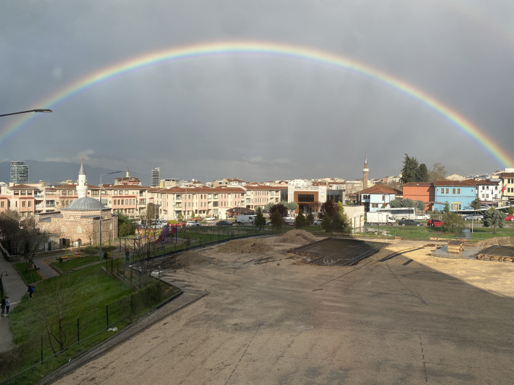 Bursa'da etkili olan yağışın ardından ortaya çıkan gökkuşağı görsel şölen oluşturdu.