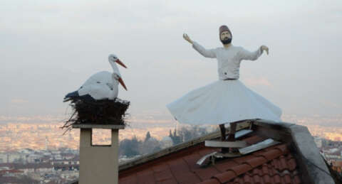 Bursa'da iki katlı bir binanın sahibi, vatandaşların dikkatini çekmek amacıyla iş yerinin çatısına semazen ve leylek maketleri yaptırdı