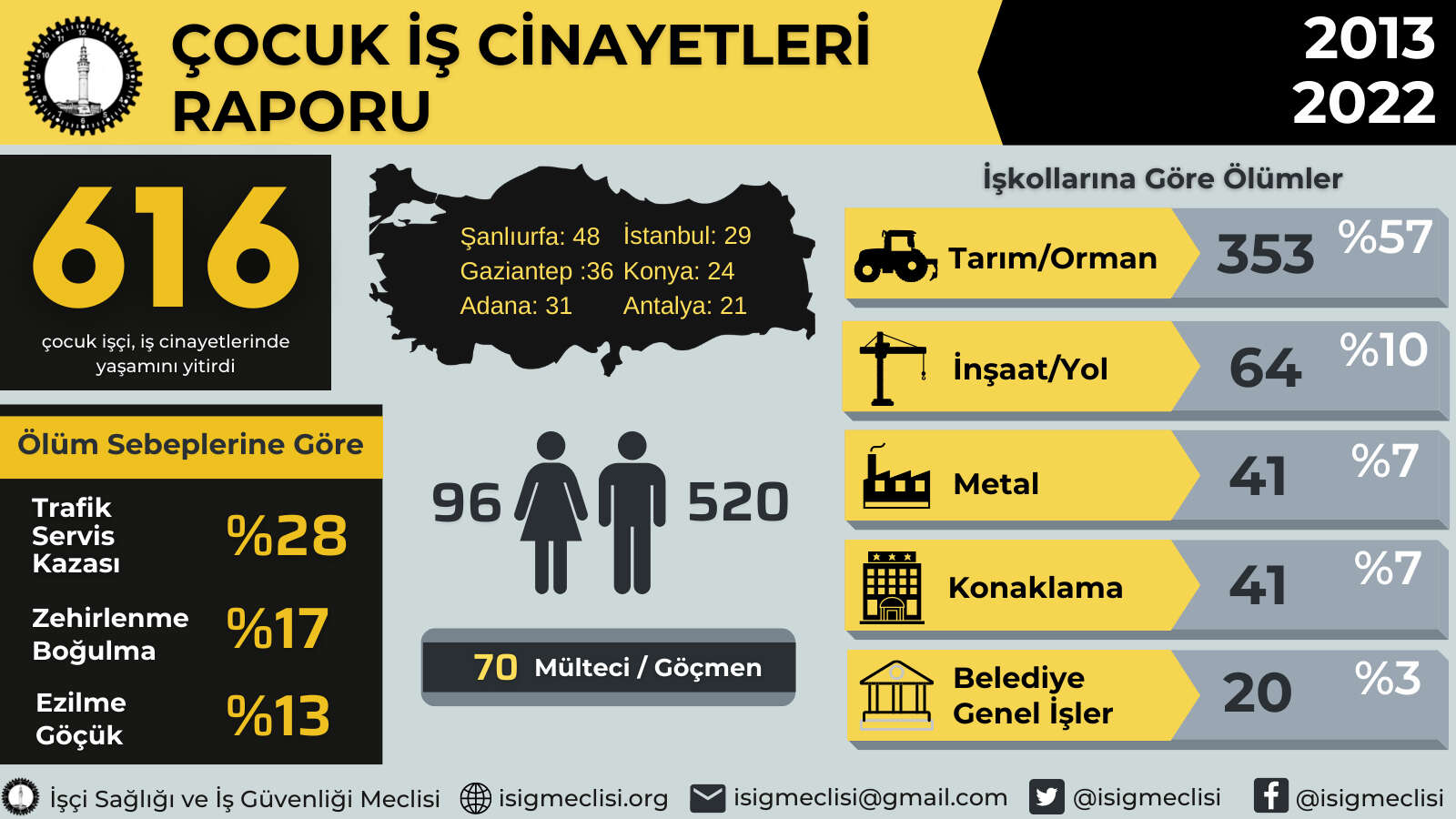 İşçi Sağlığı ve İş Güvenliği (İSİG) Meclisi, 20 Kasım Dünya Çocuk Hakları Günü dolayısıyla yayınladığı yazıda iş cinayetleri raporlarına göre; son on yılda “en az” 616 çocuk çalışırken hayatını kaybetti.