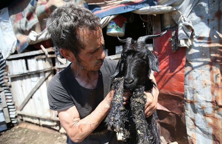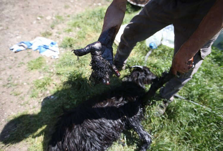 Sürünün yaklaşık 10 yıldır çobanlığını yapan Salih Toygar, kucakladığı hayvanı ağıla getirdi. Zifte bulanan hayvanı arındırmak ve yaşatmak için yoğun çaba harcayan Toygar, memeleri zarar gördüğü için yavrusunu emziremeyen Karaca'yı gözyaşları içinde temizledi.