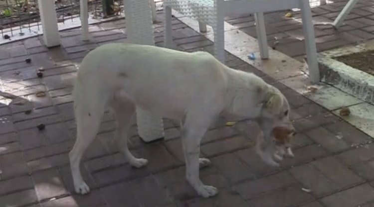 "Bir gün burada 2-3 tane yavru kedi gördük bir akşamüstü sanki birisi bırakmıştı, anneleri de yoktu, daha sonra diğer ikisi kayboldu. Bu kalan sarı, ufak kedi ölmek üzereydi, biz bakmaya başladık. Ondan sonra bir baktık ki ertesi gün bu beyaz köpek yavruyu ağzına alıp, koynuna götürdü ve akşama kadar sanki kendi yavrusuymuş gibi resmen bakıyordu, yalıyordu. Bir annelik içgüdüsüydü, yani öyle bir olaydı ki biz çok etkilendik. Fakat çok özel bir olay, bilmiyorum ben çok etkilendim. Bir haftadır bu hayvana sahip çıkıyor. Götürüyor, getiriyor, taşıyor. Neresi sıcaksa sıcak yerleri seçiyor. Bu köpek resmen bu yavruya annelik yapıyor."