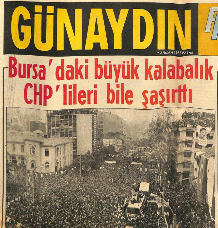 Bursa'da CHP'nin o ünlü büyük mitingiyle pek çok anı duydum yıllar içinde, kim Heykel'in hangi tarafındaydı, kiminle gelmişti, arada gazoz da içmişlerdi, Rahşan Ecevit, Busa Yükseköğrenim Derneği ile katılanların kimi sloganlarına müdahale edilmesini istemişti, ki bunu ben de hatırlıyorum, bütün Bursa'da, köylerinde ve çevre kırsalında da etkisinin nasıl hissedildiğini, seçim sonucunun, 1977 Yerel Seçimlerinden aylar önceki o mitingte ifadesini bulan ruhun söndürülmesi için de egemenlere vesile oluşturacak nitelikte telaş verdiğini anlıyorduk.