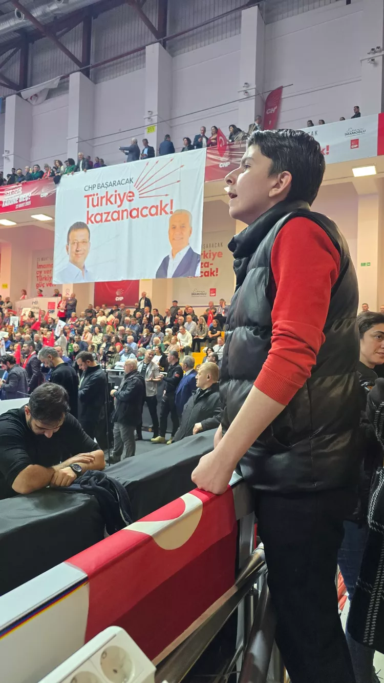 Fotoğrafın sol tarafında görünen ve konuşması boyunca Ekrem İmamoğlu’nu pür dikkat dinleyen ve adının Umut Cepe olduğunu öğrendiğim genç delikanlı İmamoğlu konuşma yaptığı kadar ona el sallamış, bayrak sallamış, alkış yapmış, slogan atmıştı. Her tepkisi yerindeydi. Son derece ciddiydi. Belli ki memleket meselelerini şimdiden dert edinmişti ve gelecekte ne olacağı şimdiden belliydi.