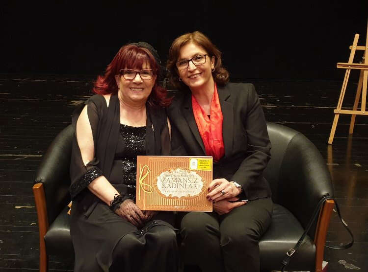 Gecenin sonunda yukarıda gördüğünüz fotoğraf için kameraya poz vermeden önce, İlknur Hanım'ın, bu programda canlandırılan 26 kadın dahil, yaklaşık 100 kadını anlattığı Zamansız Kadınlar kitabını benim için imzalamasını rica ettim. O heyecanlı kalabalık içinde imzamı da aldım, fotoğrafımı da.