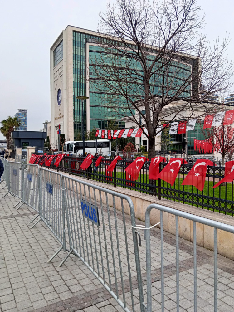 Aracımızı SGK’nın arka tarafındaki ara sokaklardan birine park ettik. Hızlı adımlarla belediyenin önündeki üst geçidi geçtiğimizde polis barikatı karşıladı bizi. Kısa süre içinde koca belediye binasının dört bir yandan demir bariyerlerle sarılmış olduğunu gördük.