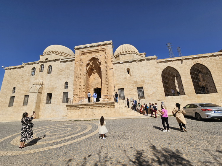 Kasımiye Medresesi’nde hem Artuklu hem Osmanlı mimarisini gördük. Artuklular başkent olarak Mardin ve Hasankeyf’i kullanmışlar. Mardin taşıyla (nahit) yapılan Taç Kapı’dan içeriye giriyoruz. Yaklaşık 2 milyon yıl önce Diyarbakır- Urfa arasında bulunan Karacadağ volkanının patlamasından oluşan bazalt taşı… Bu nedenle Mardin ve çevresinde çok sayıda taş ocağı bulunuyor. Taşlar dantel gibi işleniyor bu bölgede.