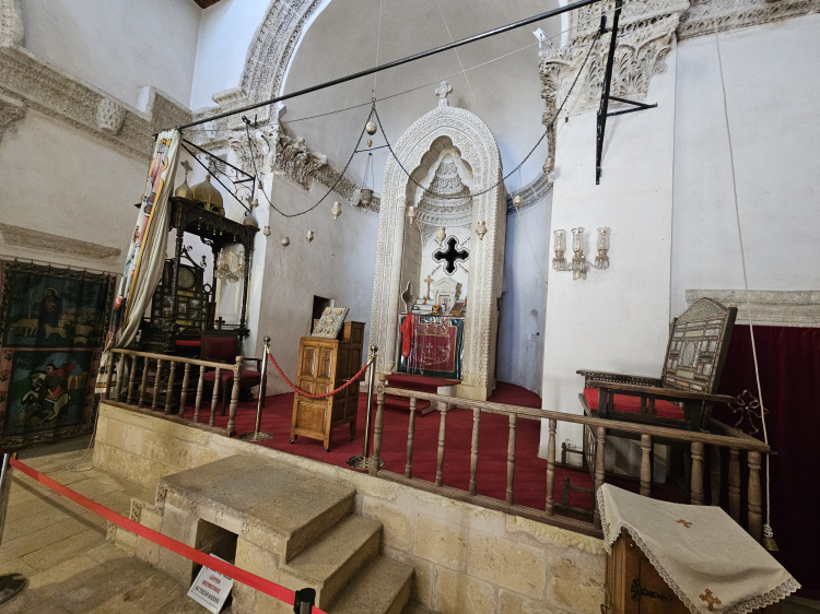 Küçük bir yeraltı tapınağı olarak inşa edilen yapı zamanla Hristiyanlık Ortodoks Süryani tapınağına dönüşmüş. Ayinlerin düzenlendiği kilisede, bir tarafta 400 yıllık ceviz ağacından yapılma Lübnan’dan, diğer tarafta ise 100 yıldan daha fazla tarihi sahip fildişinden yapılarak Hindistan’dan gelen iki adet makam kürsüsü bulunuyor.